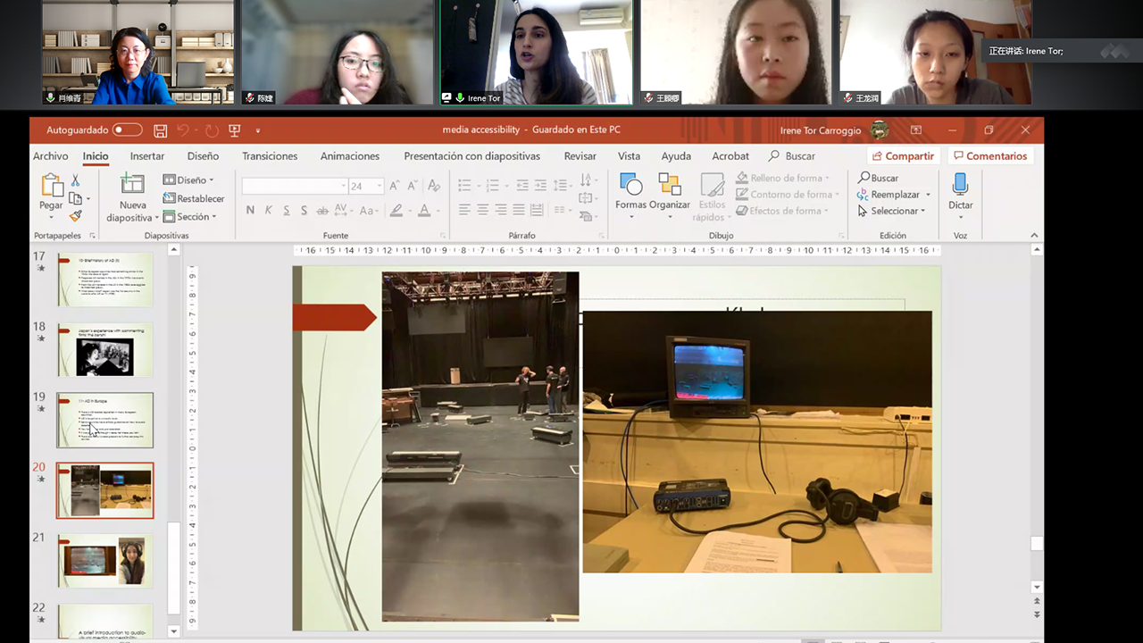随后,应邀授课的两位嘉宾分别从西方国家与中国不同的国情出发,对无障碍电影的发展历程、重要影响和制作流程等方面进行了专业的介绍。首先,董琳娜博士讲解了什么是无障碍电影,她指出,专业无障碍电影是专门来方便残障人士观看而经过加工处理的电影节目,有听障者字幕(Subtitling for Deaf and Hard‐hearing)和口述影像(Audio Description)两种形式,是指在普通电影原有的声画基础上,通过增配字幕方式或重新剪辑增补大量配音解说的方式,采用专业设备制作完成的、供有听力障碍或视力障碍的人们欣赏的电影。许多欧洲国家有相关的法律与政府资助项目来支持推动口述影像的施行,而目前中国的影视媒体中只有手语较为常见,相比之下,中国国内的无障碍电影推广仍有很长的路要走。董博士提到,翻译旨在完成从源语言到目标语言的转换,而口述影像制作过程中同样存在着图像、颜色、人物动作和表情等非语言符号与可视听语言之间的转换。肖老师也补充解释,口述影像也是一种翻译,属于符际翻译(intersemiotic translation)。