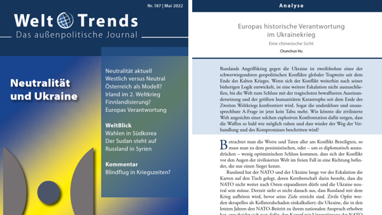 胡春春本人在《澎湃》文章的基础上,投书意大利地缘政治学期刊LIMES(“中国致欧洲:世界的命运在你们手中”,发表于2022年第3期)、德国外交政策期刊《世界趋势》(“欧洲的历史性责任”,发表于2022年第5期),其中《世界趋势》发表后,《新德意志报》于5月31日以整版形式转载了全文,并配以中国向乌克兰提供人道主义援助的图片。文章引起广泛注意之后,德国知名的知识分子电子杂志Telepolis于6月7日进行了全文转载,文章当日成为该杂志阅读量最高、评论量第二高的文章,首发期刊《世界趋势》主编特发信表达祝贺。6月16日,德国教授Klaus Schulte将文章从德文译为丹麦文,发表于丹麦政论平台Solidaritet。