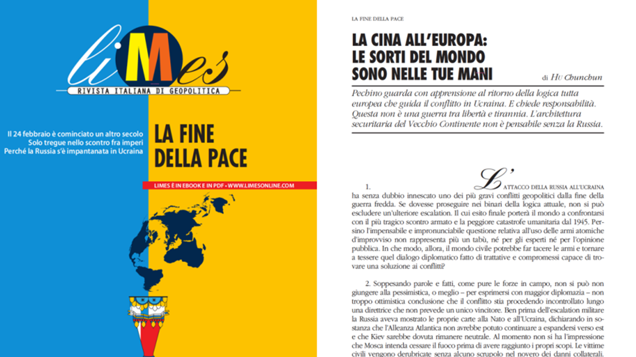 在同一期Limes中,有一篇胡春春的文章:“中国致欧洲:世界的命运在你们手中”。